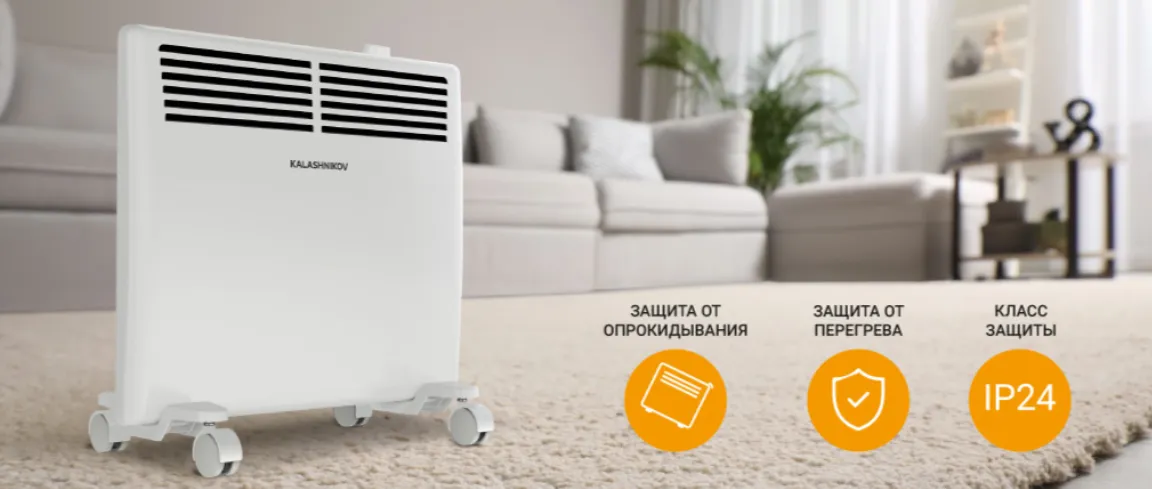 - Корпус конвектора нагревается до безопасных для человека температур; отключающий термостат служит защитой от перегрева